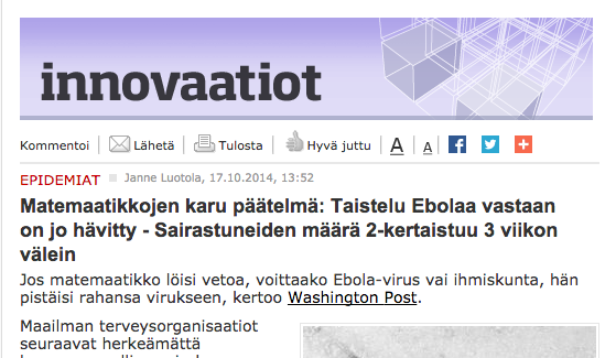 Ebola tulee, viimeinen sammuttakoon valot! Tämä on ainakin Tekniikka & Talouden viesti, kun se päätti julkaista jutun, jonka otsikko on “Matemaatikkojen karu päätelmä: Taistelu Ebolaa vastaan on jo hävitty – Sairastuneiden määrä 2-kertaistuu 3 viikon välein”. Jos jätetään huomiotta otsikon jäätävän kauhistuttava kirjoitusasu, se on lähes oikeassa: pieleen menee vain päätelmä ja sen tekijät.