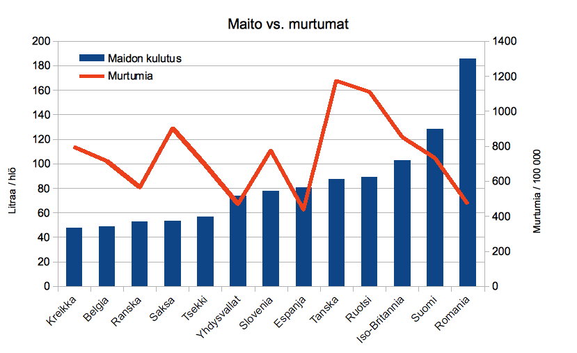 Ennakoivana huomiona myös todettakoon, että nk. A2-maidon mallimaat Uusi-Seelanti ja Australia tarjoavat nihkeästi dataa, mutta ne numerot, mitä sieltä on saatavissa, ovat isompia kuin Suomessa. Tämän hyvin epätieteellisen analyysin perusteella kyytönmaidolla ei siis meikäläisiä luita pelasteta.