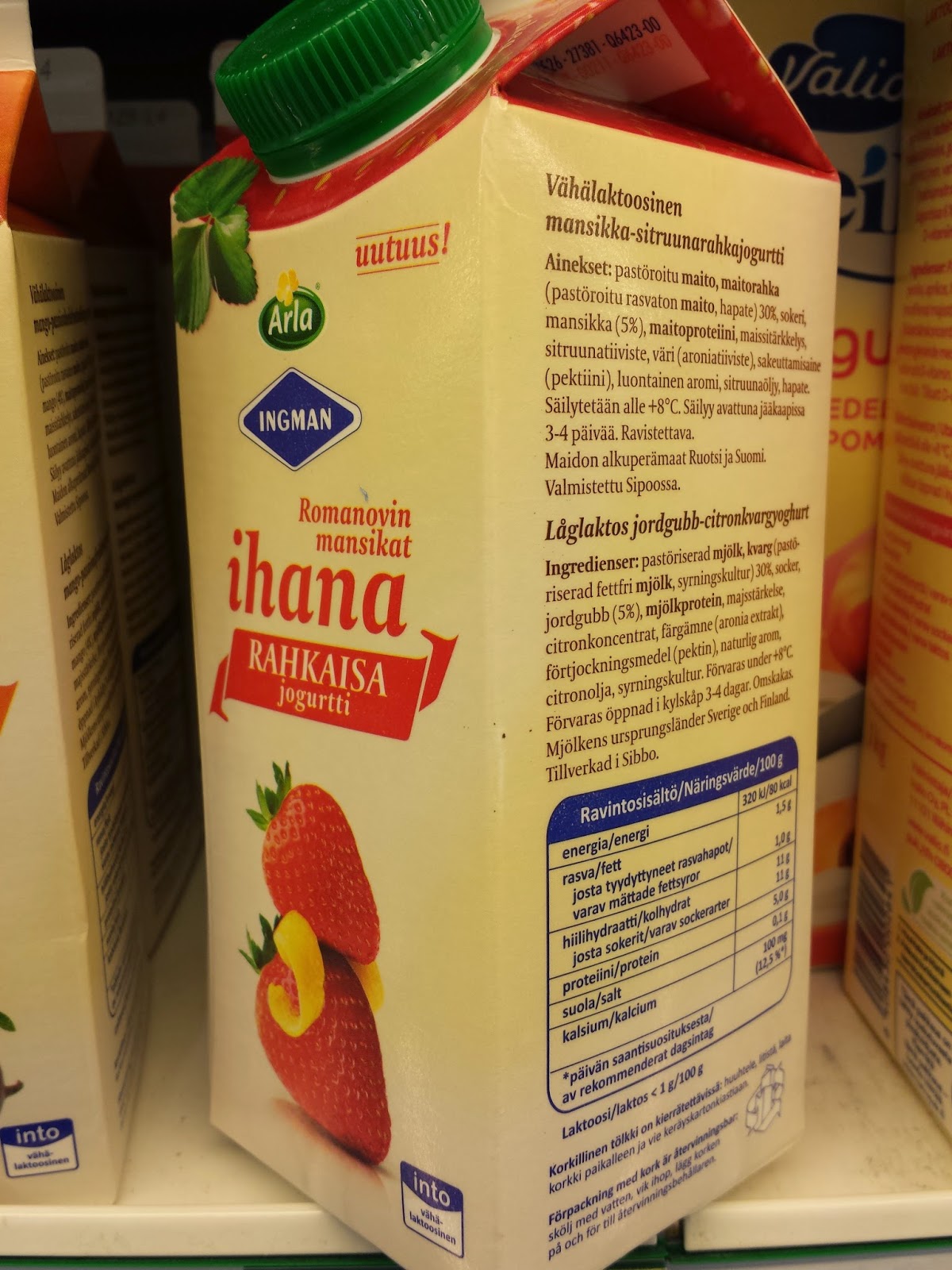 - Ainakin osa pikkupurkeista tehdään Suomessa suomalaisen ja ruotsalaisen maidon seoksesta, litran tölkeistä moni puolestaan valmistetaan Virossa paikallisesta maidosta, riisiviritykset näyttävät olevan tanskalaisia ja turkkilainen jogurtti tulee tietenkin Saksasta. On siellä puhtaasti kotimaisiakin tuotteita, mutta toistaiseksi koko sarja saa olla pannassa.